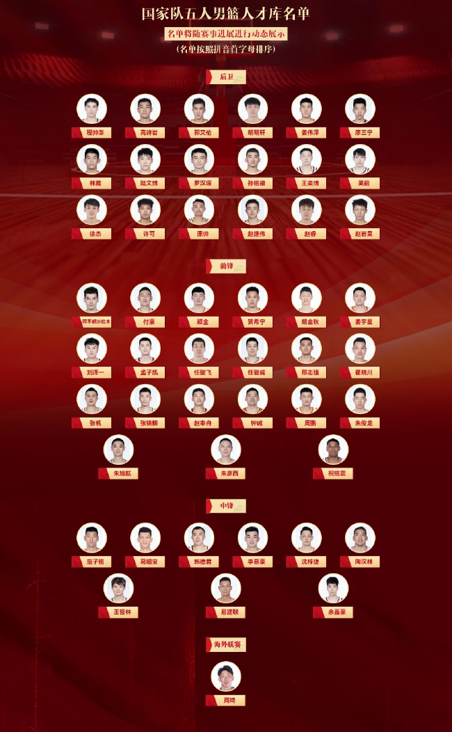 附:国家队五人男篮人才库名单(名单将随赛事进展进行动态展示,名单按照拼音首字母排序)