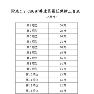 (一)新秀球员实行最低保障工资制度(不包含比赛奖金等津贴),并根据选秀顺位,获得相应的最低保障工资(见表二)。