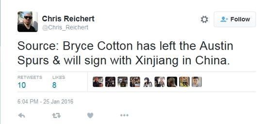 北京时间1月26日消息,据NBA发展联盟记者克里斯-理查德在推特上爆料称,布莱斯-科顿已经离开奥斯丁马刺队(发展联盟球队),他将与中国的新疆队签约。