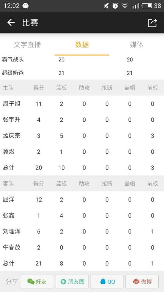 超级奶爸队屈洋12分2篮板、刘理泽6分2篮板、牛春茂2分、张鑫1分4篮板;霸气战队周子旭11分2篮板、张宇升4分2篮板、孟庆宗3分5篮板、冀煜2分1篮板。