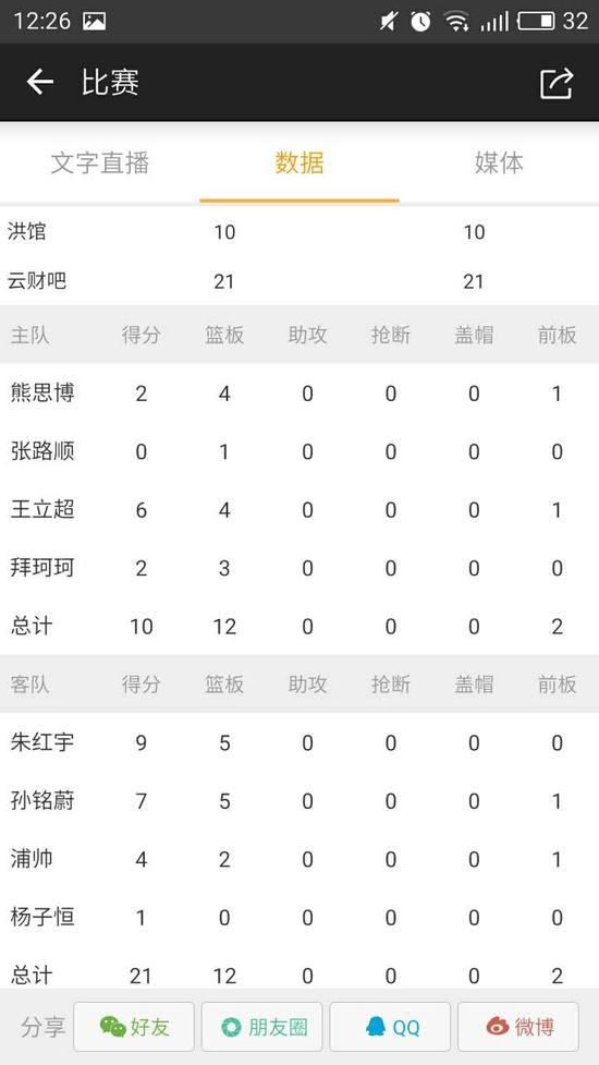 云财吧队朱红宇9分5篮板、孙铭蔚7分5篮板、蒲帅4分2篮板、杨子恒1分;洪馆队王立超6分4篮板、熊思博2分4篮板、拜珂珂2分3篮板。