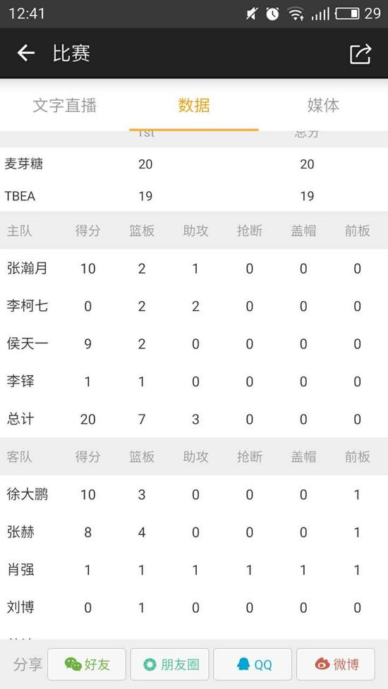 麦芽糖队张翰月10分2篮板、侯天一9分2篮板、李铎1分1篮板;TBEA队徐大鹏10分3篮板、张赫8分4篮板、肖强1分1篮板。