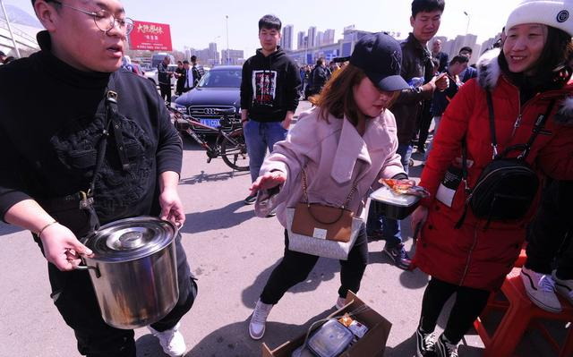 队伍旁还有卖盒饭八宝粥