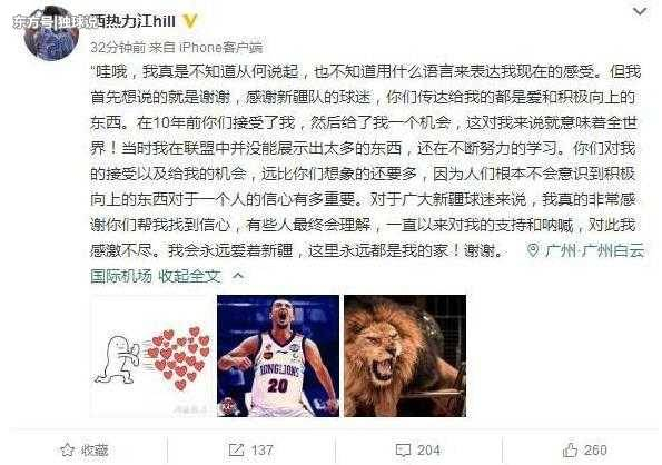 “哇哦,我真是不知道从何说起,也不知道用什么语言来表达我现在的感受。但我首先想说的就是谢谢,感谢新疆队的球迷,你们传达给我的都是爱和积极向上的东西。在10年前你们接受了我,然后给了我一个机会,这对我来说就意味着全世界!当时我在联盟中并没能展示出太多的东西,还在不断努力的学习。你们对我的接受以及给我的机会,远比你们想象的还要多,因为人们根本不会意识到积极向上的东西对于一个人的信心有多重要。对于广大新疆球迷来说,我真的非常感谢你们帮我找到信心,有些人最终会理解,一直以来对我的支持和呐喊,对此我感激不尽。我会永远爱着新疆,这里永远都是我的家!谢谢。”西热力江在离开新疆后发了这么长长的内心独白!
