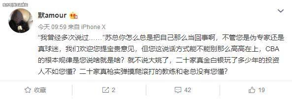 CBA改革进入深水区之后,必会牵扯一部分的利益。尽管苏群的想法很好,但总有不同意见,江苏肯帝亚总经理史琳杰就对这种说法表达了不满,他连续4条微博信息进行反击。“苏总你怎么总是把自己那么当回事啊,不管您是伪专家还是真球迷,我们欢迎您提宝贵意见,但您这说话方式能不能别那么高高在上,CBA的根本规律是您说啥就是啥?就不说大姚了,二十家真金白银玩了多少年的投资人不如您懂?二十家真枪实弹摸爬滚打的教练和老总没有您懂? ”如此激扬慷慨文字,着实让人一头雾水。