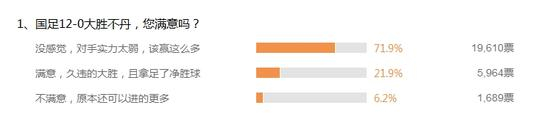 截止北京时间11月13日下午14时,新浪体育进行的关于国足胜不丹的舆论调查已有超过27000名网友参与。对于本场大胜的看法,有71.9%的球迷认为,本场大胜不足为喜,毕竟对手不丹队实力太弱,赢12个球也是理所应当。而有21.9%的网友则对比赛结果表示满意,认为国足迎来了一场久违的大胜,并且赚足了净胜球。只有6.2%的网友对国足表现不满意,认为国足还可以进得更多。
