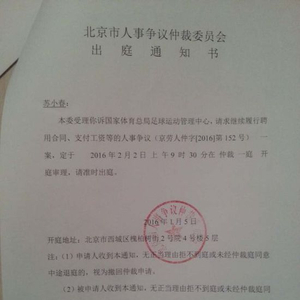 日前,北京市人事争议仲裁委员会出具受理案件通知书,接受苏小春诉国家体育总局足球运动管理中心,请求继续履行聘用合同、支付工资等的人事争议一案,并定于2016年2月2日开庭。