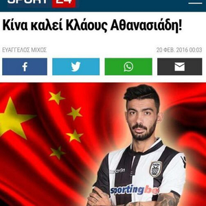 希腊媒体“sport24.gr”还透露了一个与中国俱乐部有关的绯闻,一家中国俱乐部报价希腊超级联赛塞萨洛尼基的中锋阿塔纳西亚迪斯。阿塔纳西亚迪斯,现年27岁,身高1.84米,右脚型选手,曾效力潘塞雷科斯,2006年加盟塞萨洛尼基,合同到2018年6月30日。本赛季,阿塔纳西亚迪斯代表塞萨洛尼基各项比赛出场28次打入9球并有3次助攻。作为希腊国脚, 阿塔纳西亚迪斯曾12次代表希腊国家队出场,没有取得进球。目前,德国《转会市场》给阿塔纳西亚迪斯标出的评估身价为400万欧元。