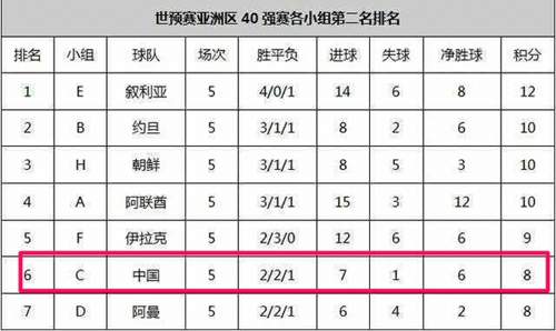 神预言国足将逆天出线,当然,前提是最后一轮国足必须战胜卡塔尔。请看最后一轮前,各组第二名的积分情况(四个成绩最好的小组第二出线),其中叙利亚基本出线,那么国足出线的竞争死敌就是下列五队:约旦/朝鲜/阿联酋/伊拉克/阿曼。再来看看四天后的最后一轮对阵形势: