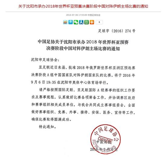 北京时间7月6日,中国足协在其官网发布通知,正式宣布沈阳将成为国足世界杯预选赛12强赛首个主场比赛举办城市。国足12强赛的首个主场将于2016年9月6日对阵伊朗队。