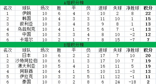 世预赛12强赛完全积分榜 国足小组第5遗憾出局