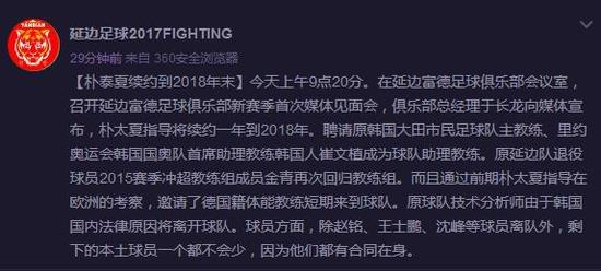 据“延边足球2017FIGHTING”微博消息,今天上午延边富德俱乐部召开了新赛季首次媒体见面会,俱乐部总经理于长龙宣布与朴泰夏指导续约一年到2018年,并聘请原韩国大田市民足球队主教练、里约奥运会韩国国奥队首席助理教练韩国人崔文植成为球队助理教练。原延边队退役球员2015赛季冲超教练组成员金青再次回归教练组。