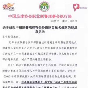 12月23日,中国足协向各中超俱乐部下发了《关于修改中超联赛规程有关外籍球员报名条款的征求意见函》 。在《意见函》中足协提议,将中超球队的外援人数由“4+1”改为“3+1”。