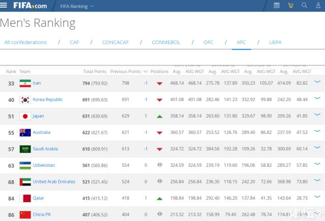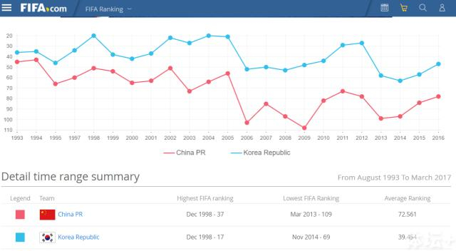 国足韩国FIFA排名纠葛史:最多落后64位 还曾领先