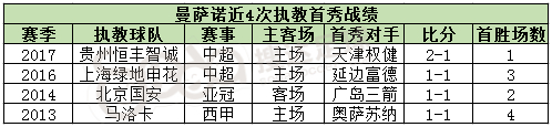 今晚中超联赛贵州恒丰智诚主场同天津权健的比赛,是贵州新任主教练曼萨诺上任后的首场比赛,凭借耶拉维奇的绝杀,贵州恒丰智诚最终2-1险胜。贵州是曼萨诺在中超执教的第三支球队,这场胜利也是他首次在中超球队的执教首秀中获得胜利。在之前执教的北京中赫国安和上海绿地申花这两支球队的首秀时,都战成了平局,而且比分都是1-1。更为巧合的是,在曼萨诺来到中国之前,他在第三次接手西甲马洛卡的首秀中,也是取得了一场平局,比分还是1-1。