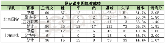 曼萨诺之前在中国执教的成绩应该说还是不错的,虽然对于他的战术理论有过很多争议,但是曼萨诺还是取得了不错的战绩。在北京国安的两年,一次亚军,一次第4,还率队进入过亚冠十六强。在中超的60场比赛中,曼萨诺的胜率高达61.7%,总胜率也超过50%。在上海申花的一年中,虽然胜率(44.4%)远不及在北京国安,但还是时隔十年后帮助球队再次获得亚冠资格。