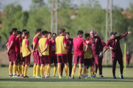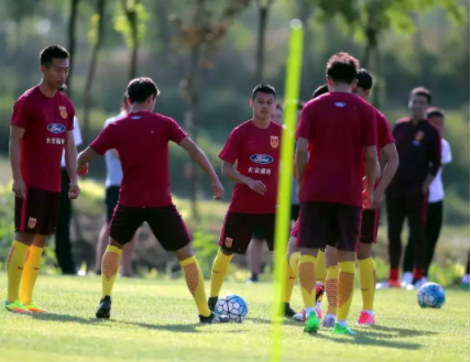 训练正式开始后,傅欢、石柯、贺惯、吴兴涵和何超等昨天刚参加了中超联赛的球员在一旁进行慢跑恢复。其他队员在热身结束后进行了简单的分组对抗,里皮和他的教练团队要求队员们更注重前插和无球时的跑动,而队员们也都在训练时拼尽全力。首堂训练课持续一小时左右,明天队员们将进行一天两练,更好地熟悉技战术。