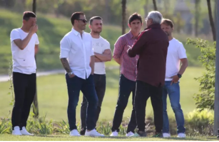 今天下午五点,全体队员在主教练里皮的带领下,在天津权健足球俱乐部训练场进行了建队后的首堂训练课。天津权健主帅卡纳瓦罗在球队训练前特意来到场边拜见自己的恩师里皮,二人也在场边亲切交谈。