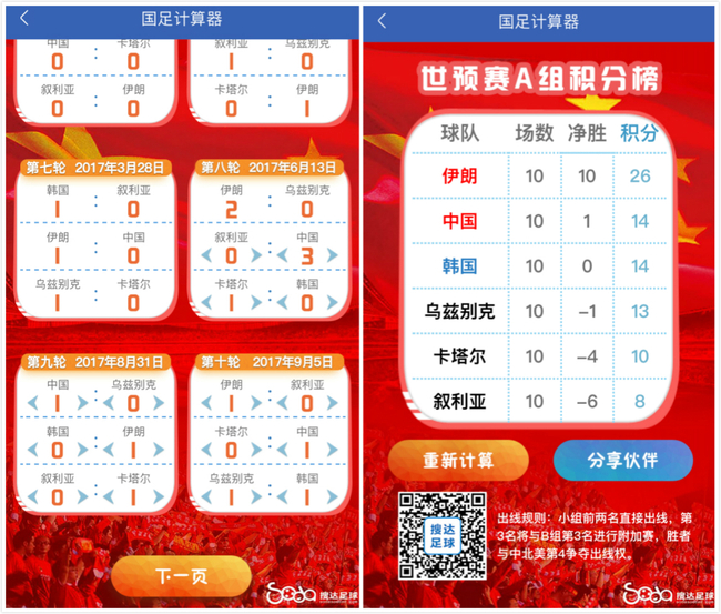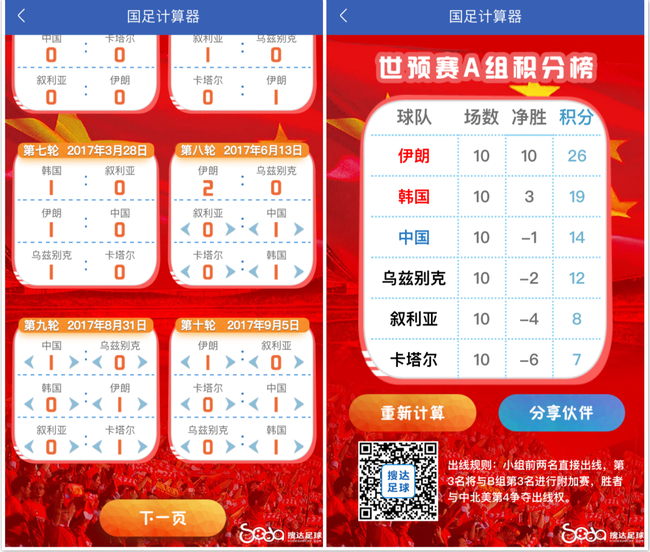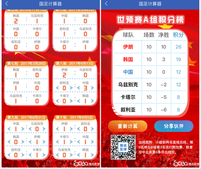 欢迎使用搜达足球APP“国足计算器”功能,随时根据比分变化推算国足出线形势!打开搜达足球APP,选择底部“工具”栏,就可找到“国足计算器”!