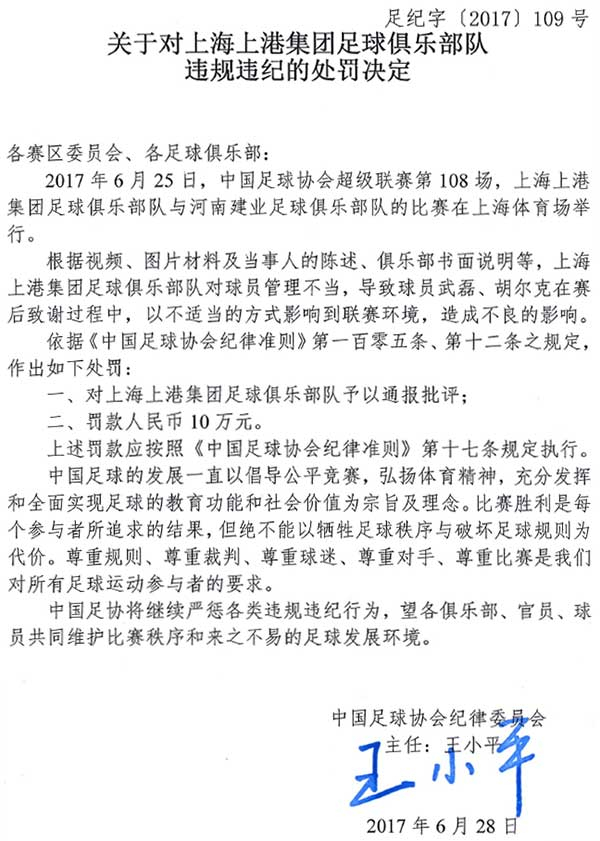 北京时间6月30日消息,中国足协公布对上海上港足球俱乐部处罚决定,上港俱乐部对球员管理不当,被给予通报批评并罚款10万人民币。