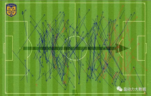 ▲江苏苏宁易购横向活球传球路线图(蓝色为传球成功,红色为传球失败)