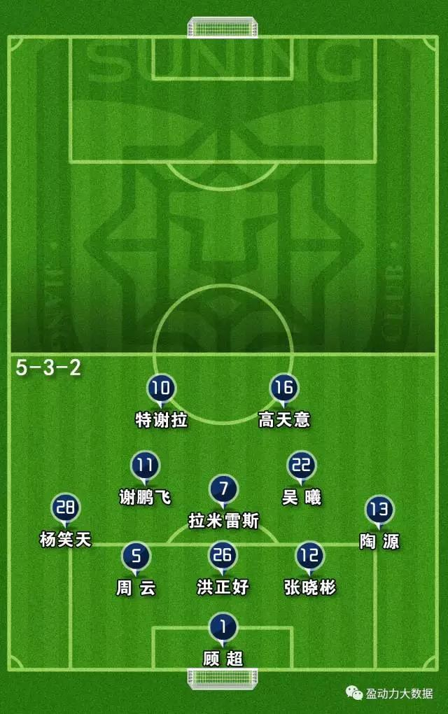 江苏苏宁易购队此战依然排出一直使用的3中卫阵型。李昂停赛的空缺由张晓彬填补,前场特谢拉和高天意搭档前锋。值得注意的是,本场比赛苏宁队的3中场站位。拉米雷斯处在拖后的位置,谢鹏飞和吴曦两名本土球员为两名前锋提供支援,三名中场球员呈倒三角的站位。这种攻击性更强的中场组合可以体现出江苏苏宁易购队力争在主场取胜的决心。