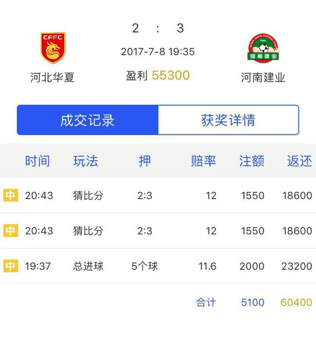 本轮最大的冷门当属河北华夏2:3输给河南建业的比赛,赛前各方普遍看好华夏可以轻松拿下。用户ID为阿D32131在比赛开始前预测本场总进球数为5个。半场结束后,在河南建业2:0领先的情况下,该用户再次投注全场比分为河南建业3:2河北华夏,最终预测成功,成为本场竞猜王,共计盈利55300积分排名第一,获得一张200元京东e卡。同时他还在辽宁开新与贵州恒丰的比赛中成功猜对总进球和比分,盈利22416积分,成为本轮的最大预测牛人。