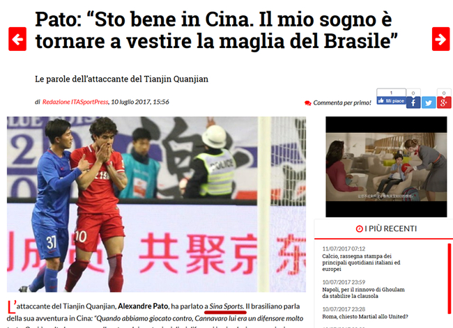 上周,现效力于中超天津权健的巴西球星帕托来到了未与北京的新浪总部大楼,参与了多项互动活动,并且接受了新浪体育的采访。近日,帕托的新浪之行吸引到了包括英国天空体育等多家外国媒体的关注,外媒们纷纷在自己的网站上刊载帕托新浪之行的视频以及专访。