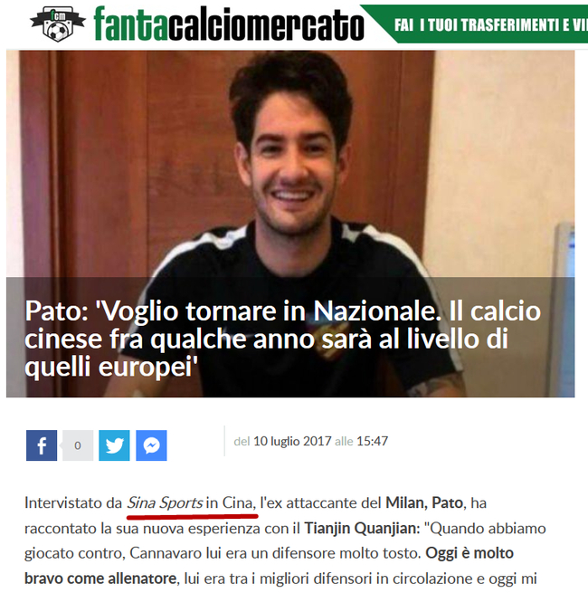 外媒报道新浪体育对帕托的专访