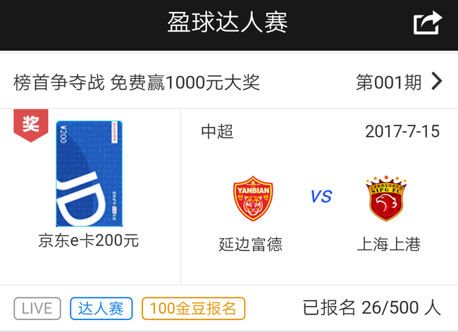 报名参与竞猜中超:延边富德VS上海上港