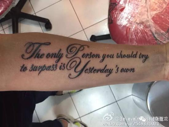 李海龙的左手臂上纹着一行英文,“The only Person you should try to surpass is yesterday‘s own”寓意是:赶超过去的自己。对于未来,李海龙近期有两个目标:一是争取下半赛季多踢比赛,二是几年后成为鲁能主力框架中的一员。