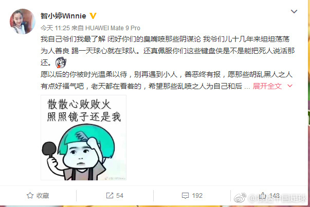 可能是也看到了球迷的质疑,今日,杨智的夫人在微博上写到:我自己爷们我最了解,闭好你们的臭嘴喷那些阴谋论,我爷们儿十几年来坦坦荡荡为人善良,踢一天球心就在球队。还真佩服你们这些键盘侠是不是能把死人说活那还。