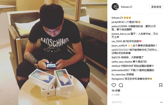 赌约并没有影响武磊,在上轮联赛中,他将自己的联赛进球数提升到了20粒,一举创造个人新高,而傅欢今天也在社交平台上晒出了照片,桌子上摆出4台iPhone X,有球迷搞笑留言,“磊子:人在家中坐,叉从天上来”。