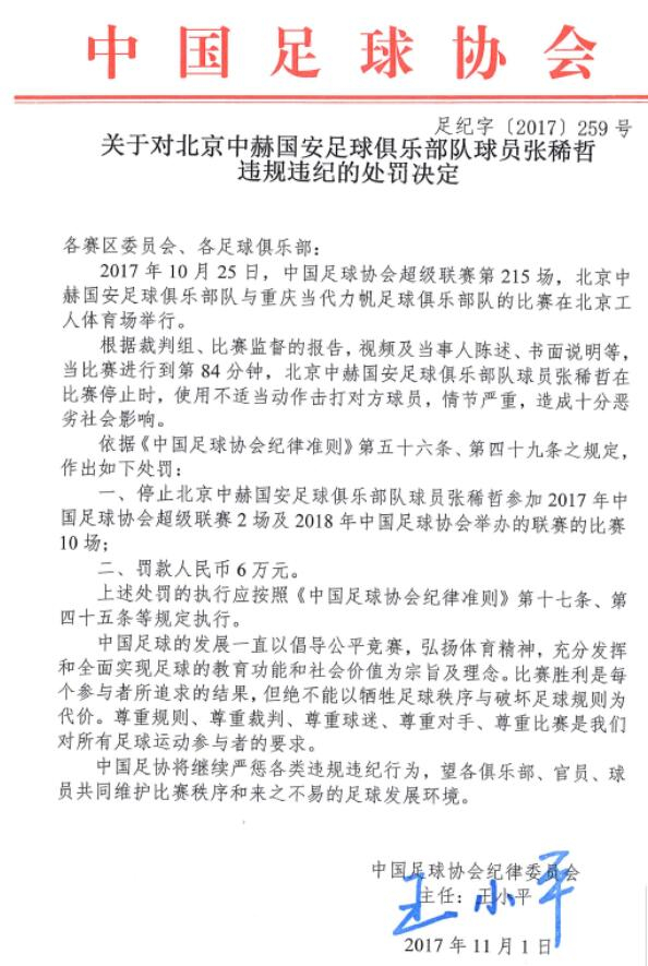 11月3日,国安球员张稀哲因在与力帆的比赛中有击打对方面部的行为,被足协停赛12场。