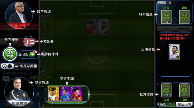 每一小节游戏中,双方轮流出牌,直到一方无牌可出或者主动放弃该节比赛(点击左侧放弃按钮)时一小局结束。结束时场上比分高的一方获胜,将获得一个足球;如果比分相同则算平局,双方都将获得一个足球