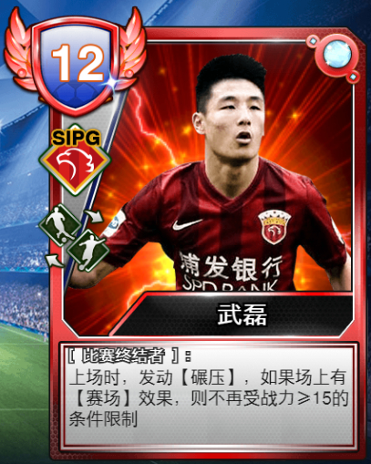 在《绿茵纵横》游戏中,武磊也具有非常强力的技能[碾压]:同位置对方卡牌战力总和≥15,那么战力最高者(若最高战力为多个,则全部)进弃牌。要知道,武磊这张卡牌可以放置在前场和中场两个位置,这就意味着,一旦对手掉以轻心,那么他将以摧枯拉朽之势将符合条件的对手卡牌摧毁下场,从而获得比分上的巨大领先优势