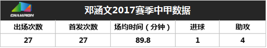 邓涵文20岁就已经在中甲呼和浩特踢上比赛,被里皮发掘之后,他回到北京人和队中,变成本赛季的绝对主力,首发出场27次只有1次被提前换下,打入1球,送出4个助攻。
