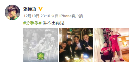 在这条以“分手季”为主题的微博中,张稀哲只是简单地留下一句“讲不出再见”,并附上了三张照片。其中第一张照片为赛场庆祝的小型海报,图中的伊尔马兹和克里梅茨已经离开国安,拉尔夫也已确定不再与国安续约;第二张和第三张照片则为张稀哲与数名队友的合影,其中包括了赵和靖、张晓彬和李翰博等。这几名球员在刚刚结束的赛季中都没有得到国安主帅的重用,在这条道别意味深重的微博中,张稀哲似乎也在暗示这几名球员将缘尽国安。