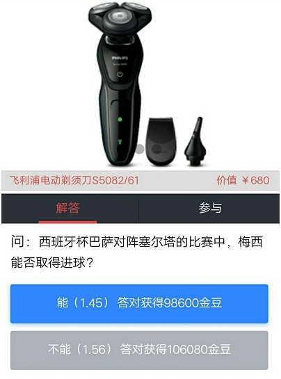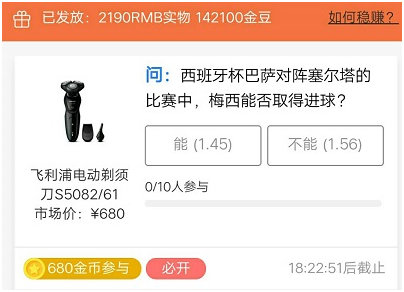 那么神奇的“稳赚”游戏是如何保证大家“雨露均沾”的呢?首先对于答题正确的用户,我们会送上极为丰厚的金豆奖励。例如图中的问题“西班牙杯巴萨对阵塞尔塔的比赛中,梅西能否取得进球?”,玩家答对即可获得对应赔率下的金豆。轻松应答赚取至少45%的收益,何乐而不为呢?