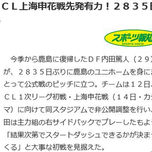 2月14日,在2018年亚冠联赛小组赛的首回合比赛中,上海申花将对阵鹿岛鹿角队。从德甲归来的日本国脚后卫内田笃人有可能时隔2835天重新身穿鹿岛的球衣,出现在这场亚冠比赛中。[为中国队助威,竞猜亚冠赢千元豪礼!]
