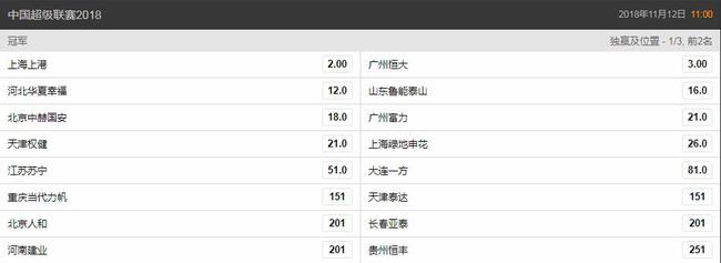 最新夺冠赔率显示,上海上港继续以1赔2的优势领跑,独占鳌头。曾经的霸主,广州恒大以1赔3位居次席。两队实力差距不大,但上港是打江山,恒大是守江山,难易程度还是不同。前3轮战罢,上港保持全胜,净胜球多达13个,锋芒毕露。本赛季,他们将有极大可能,撼动恒大王朝。