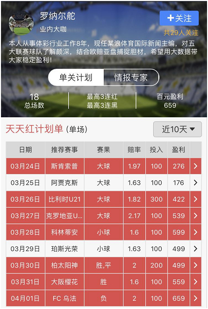 又是一位老熟人,一直稳居盈利率榜单前列的大神罗纳尔舵最近也是状态爆表,近9场比赛斩获7红2黑的数据保持非常稳定的盈利率,另外罗纳尔舵的情报推荐目前也是2连红的走势,非常值得跟进!