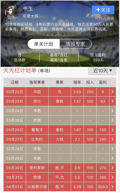 我们之前已经推荐过的高手<书生>,近期依然保持十分恐怖的胜率,单关计划近10天一共推荐了7场,全部红单100%的命中率!看来运营着彩票自媒体公众号的大咖果然有料啊!小编已经迫不及待想要认识一下这位大神了,目前已经联系上<书生>,近期带来书生的多牛专访,敬请关注!