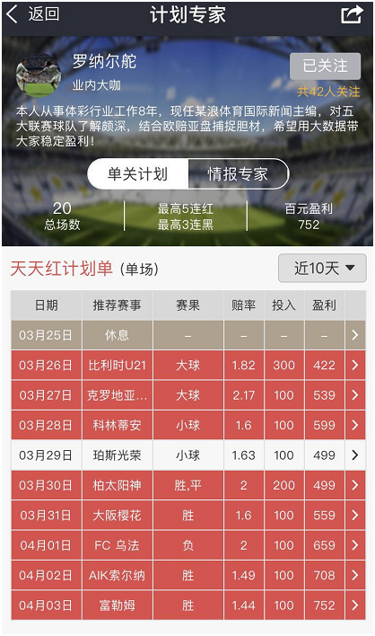 上边这位就是新浪特邀专家:罗纳尔舵,自入驻多牛以来一直处于连红状态,最近9中8的命中率也是目前最受关注的专家。作为足彩行业的专业人士,罗纳尔舵对足球和欧赔亚盘的了解极深,门户网站出身的他人脉更是广泛,国内外的足球记者、博彩公司操盘手很多都是其好友,所以球队内料上要远超很多专家,能一直连红绝非运气,今晚他依旧会为大家带来单关以及情报推荐,助大家红单度过欧冠夜!