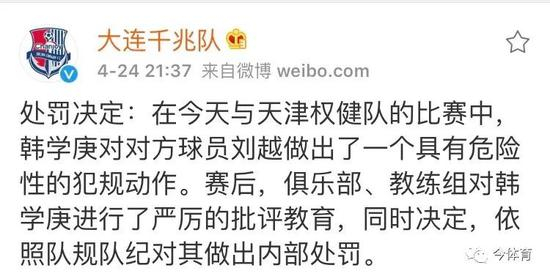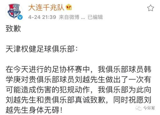 在4月24日进行的中国足协杯赛天津权健队客场与大连千兆队的比赛中,天津权健队球员刘越被对方球员韩学庚的严重犯规动作侵害。赛后,大连千兆足球俱乐部和韩学庚本人都为这一恶意犯规进行了道歉,相信中国足协对于韩学庚会有追加处罚。令人遗憾的是,对于这一双方都认可的恶意犯规,当值主裁判竟然连黄牌都没有出示,中国足球裁判的水平再一次让人遗憾。
