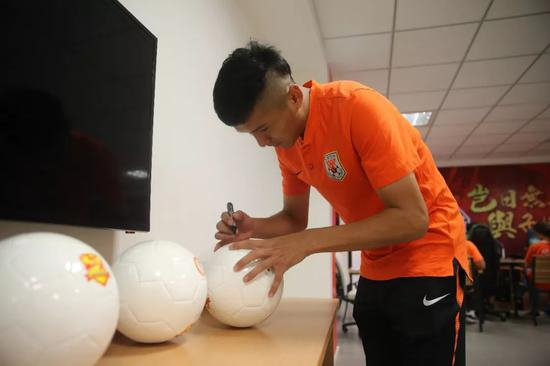 对抗赛结束后队员齐天羽为参与电竞活动的球迷赠送了亲笔签名的足球,并进行合影留念。