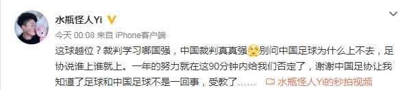 女足队员丁旋在微博上说:“这球越位?裁判学习哪国强,中国裁判真真强,别问中国足球为什么上不去,足协说谁上谁就上。一年的努力就在这90分钟内给我们否定了,谢谢中国足协让我知道了足球和中国足球不是一回事,受教了……”