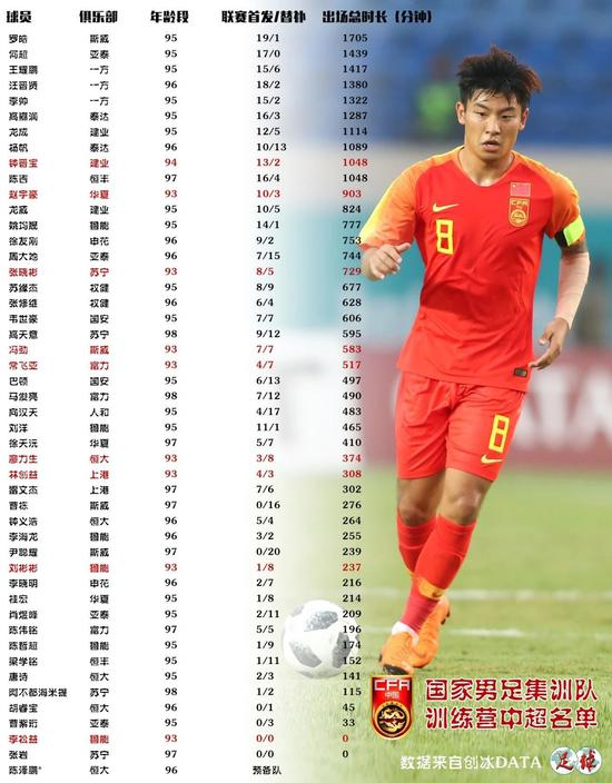 此次入选集训队训练营名单的U21球员共有10人,除了贵州恒丰的97年球员陈吉(1048分钟)和苏宁的高天意(595分钟)外,其余8人出场均不足500分钟,其中包括了转会苏宁后并无出场表现的门将张岩。
