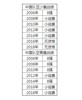 国少队在2002年和2004年都获得了世少赛资格,其中2004年更是以亚洲冠军身份晋级。但此后就开始在一路走低,再也没有在亚少赛中进入过前四名,也再没打进过世少赛。其中,2006年亚少赛,国少队止步1/4决赛,2008年、2010年、2012年和2014年亚少赛,中国队均没有小组出线。而2016和2018年亚少赛,中国队甚至连决赛阶段的资格都没有获得。