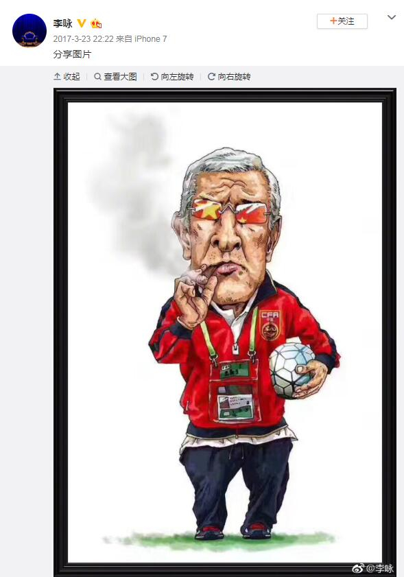 李咏生前曾关心国足 赢韩国后他发里皮漫画图庆祝